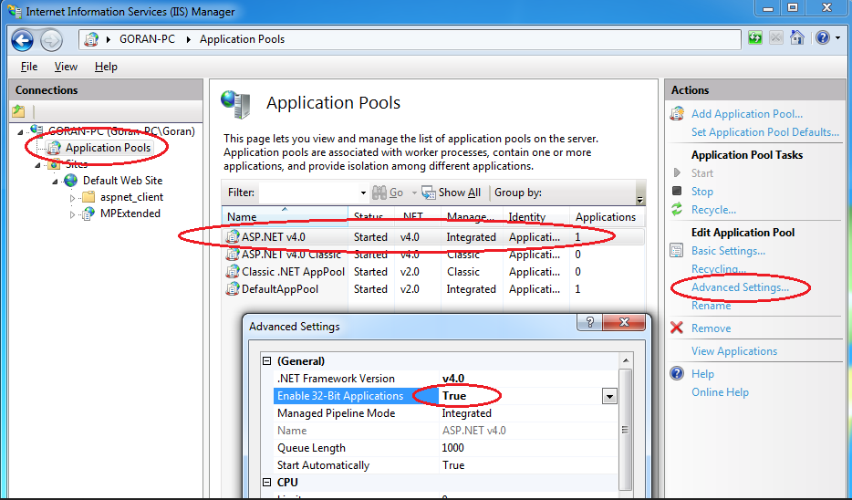 5.Enable 32 bits applications on the AppPool assigned to Myvision