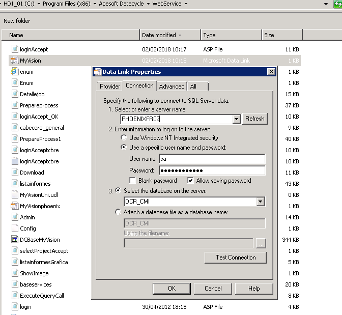 6. Setup the database repository connection. Open the file MyVision.udl on the Web folder and enter the connection values :